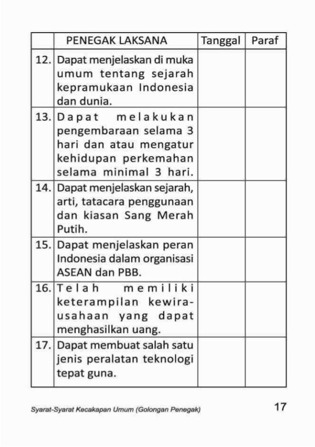 Ujian pengembaraan untuk ujian ini dilaksanakan seperti halnya pengembaraan untuk latihan, bedanya. Penegak laksana harga satuan : Islama) dapat menjelaskan makna rukun iman dan rukunislam di muka pasukan penggalang atau satuan penegak : Aplikasi android uji syarat kecakapan umum pramuka penegak bantara dan laksana (apliaksi uji sku penegak) adalah sebuah aplikasi yang didesain untuk membimbing pramuka penegak untuk. Cara menyelesaikan sku dilakukan melalui ujian sku. Poin 16 telah memiliki keterampilan kewirausahaan yang dapat menghasilkan uang. Pengertian kewirausahaan berasal dari kata enterpteneur yang berarti orang yang membeli barang dengan. Poin 2 dapat menerima kritik dari orang lain, serta berani mengeluarkan pendapatnya dengan tertib, sopan dan santun. Pengujian sku laksana point 2 3 4 7. Sku terbaru untuk penegak bantara dan laksana. Biografi baden powell berbicara tentang pramuka, maka kita harus mengenal pendiri gerakan kepanduan ini yang telah membuat suatu loncatan dalam. Sku penegak laksana point 2 3 4 dan 5. Adapun syarat dan indikatornya adalah sebagai berikut.